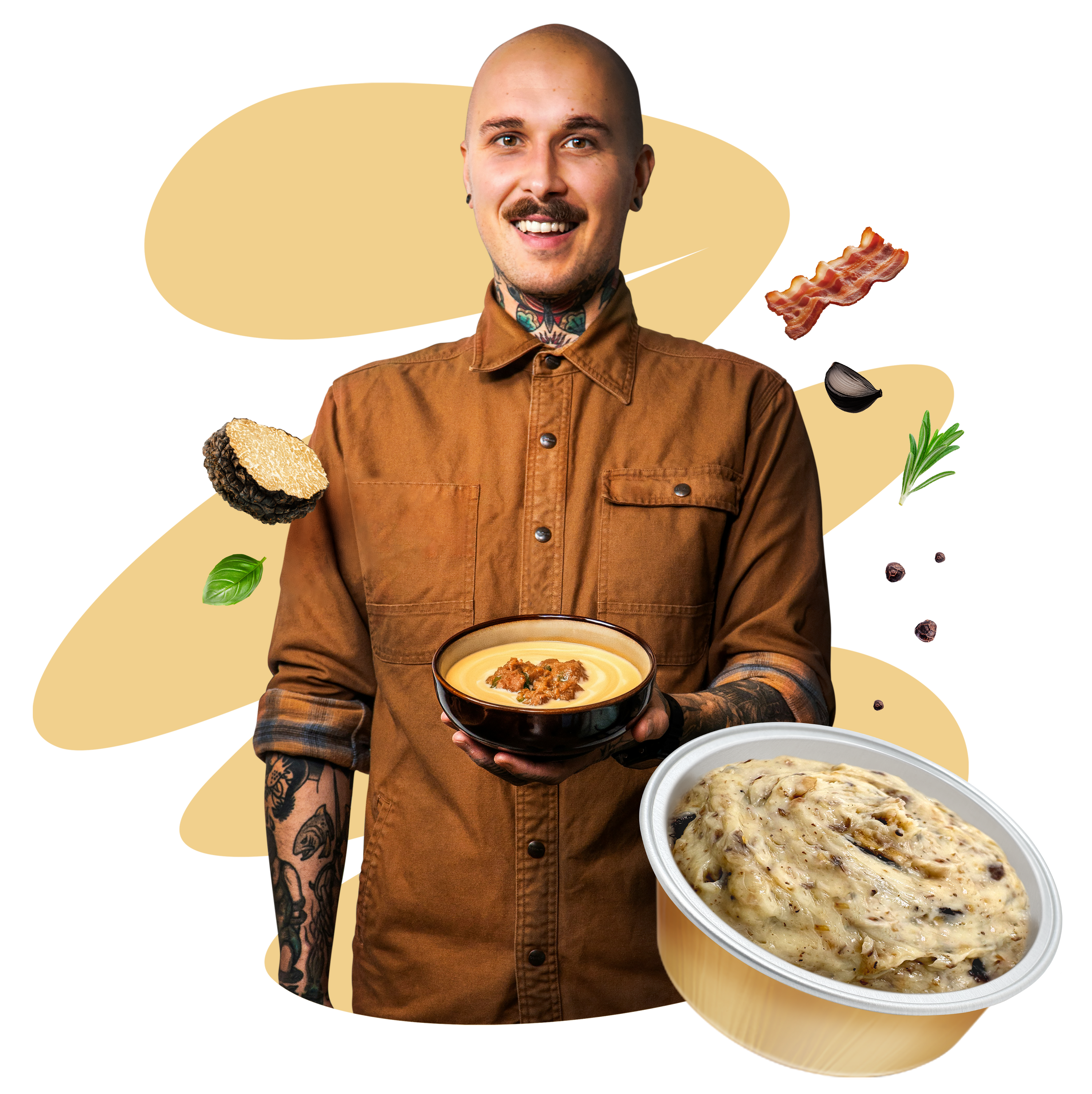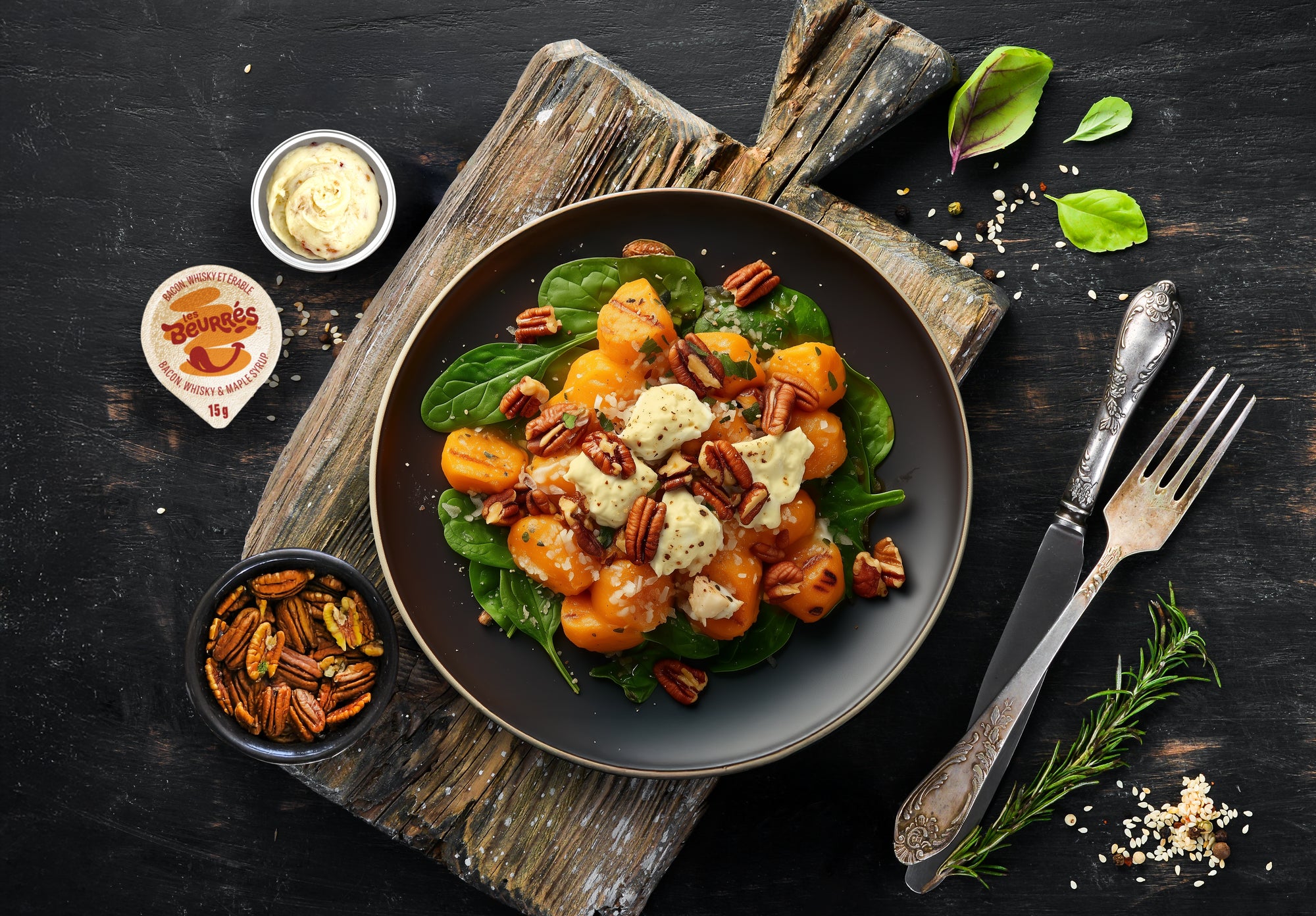 Un accord sucré-salé à tomber : la douceur de la patate douce, la fraîcheur du fromage de chèvre et le fondant du beurre bacon-whisky pour une explosion de saveurs.