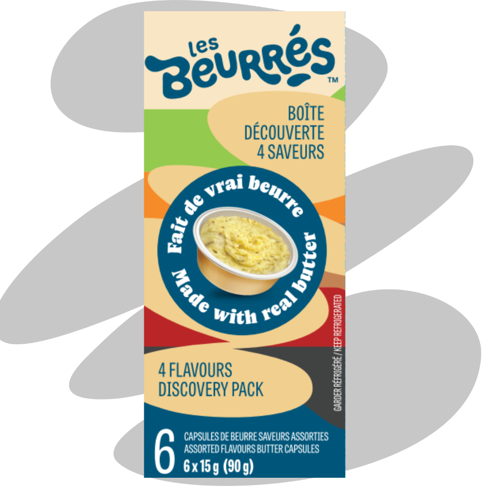 Notre boîte découverte est la parfaite entrée dans l'univers Les Beurrés pour celui qui veut tout goûter! La boîte contient 6 capsules de 15g (2x Citron confit et fines herbes, 2x Bacon, whisky et érable, 1x Ail noir et balsamique, 1x Truffe forestière).